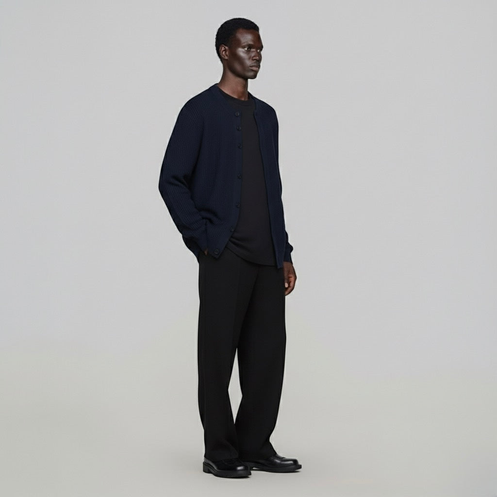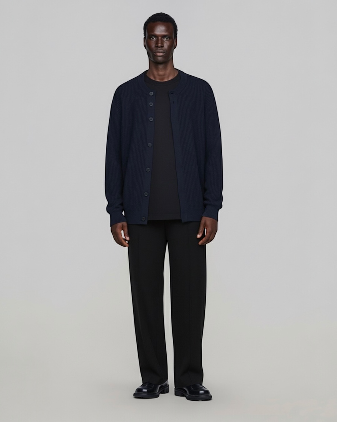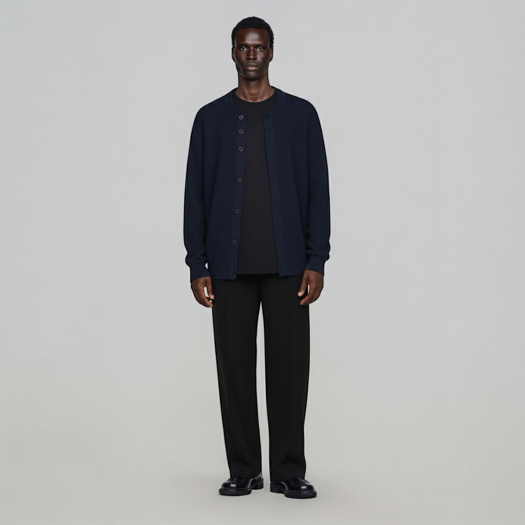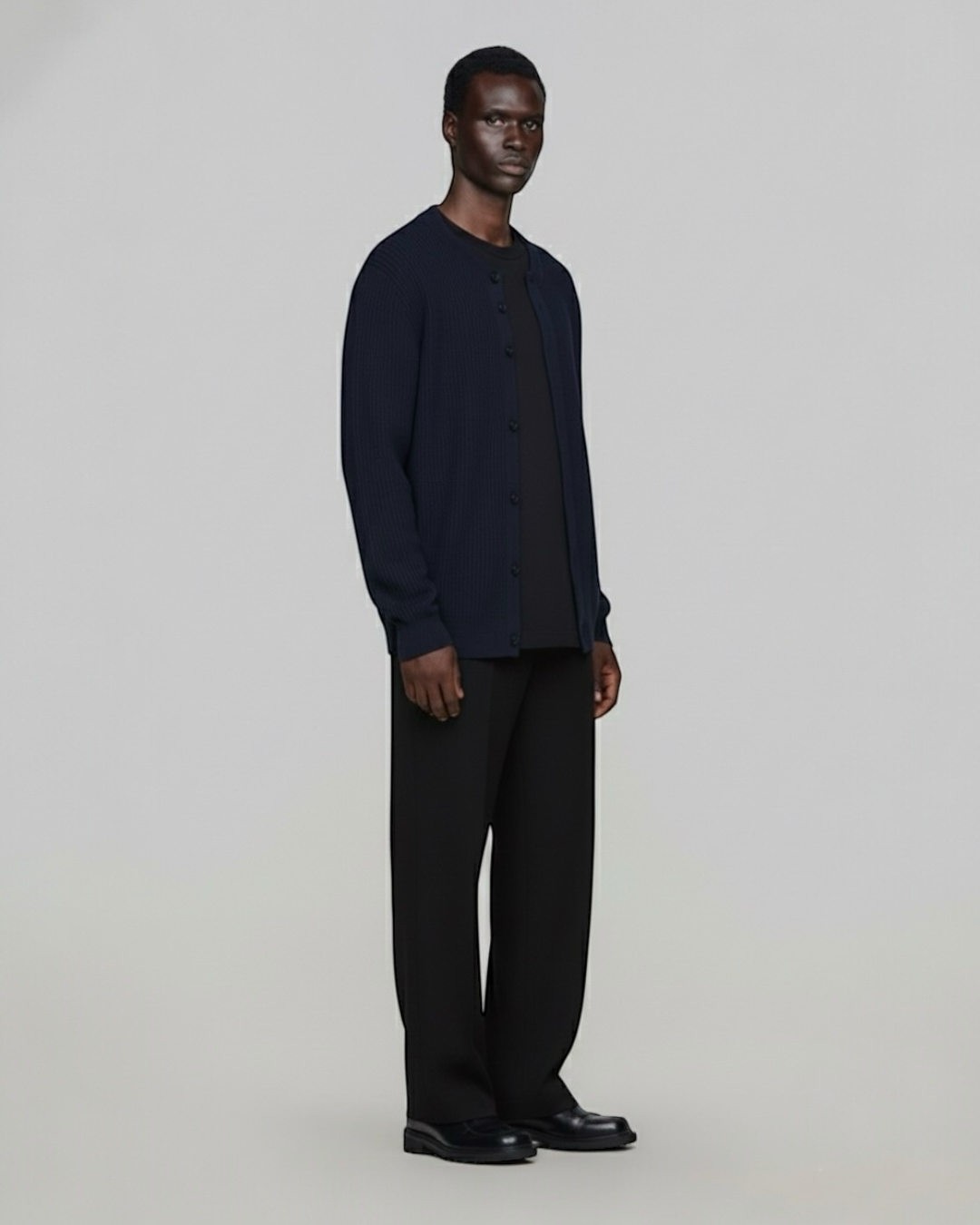 A refined cardigan defined by clean lines and understated detailing. The hidden button placket emphasizes minimalism, while the finely knitted texture adds depth and sophistication. Crafted from a soft viscose blend, this piece offers both comfort and structure, making it an essential layering staple.